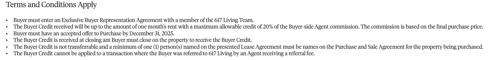 When you decide to purchase a property through 617 Living, you will be eligible for a Buyer Credit up to the amount of one month of your current rent.