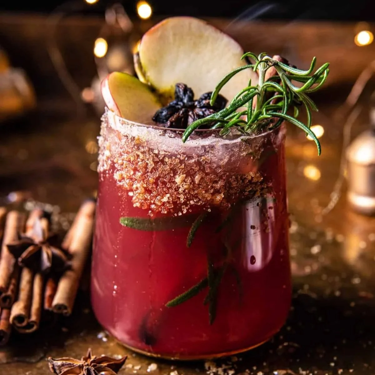 Garnish with apple slices, cinnamon sticks, and rosemary. If desired light the cinnamon stick (or use star anise) on fire for a smoky effect.