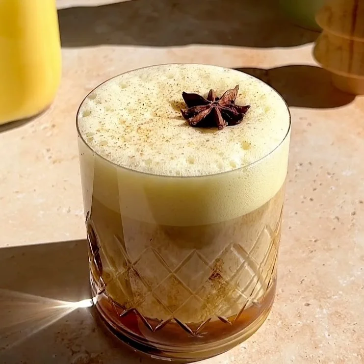 Float frothed eggnog on top, using the back of a bar spoon to help layer.