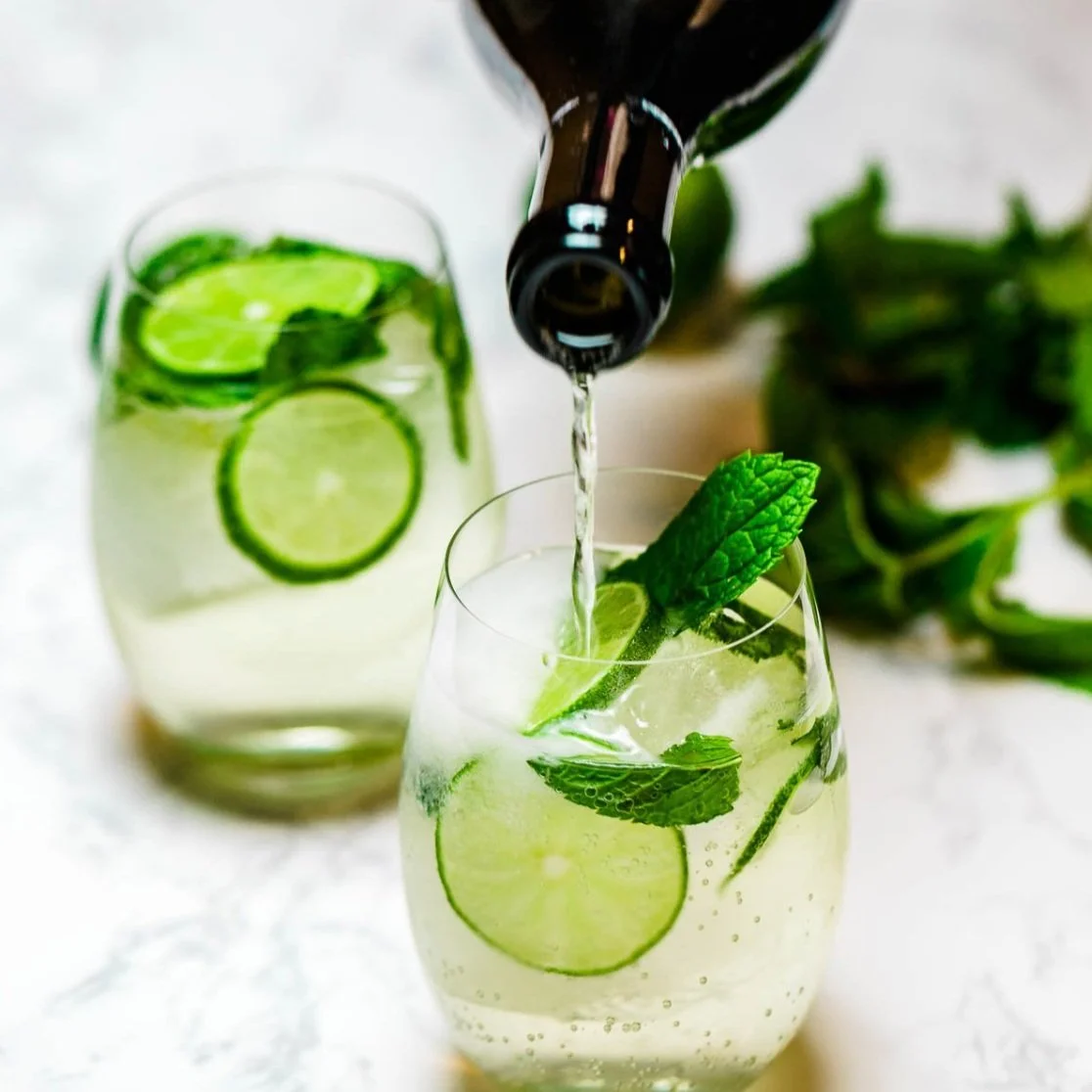 Add 1 oz of elderflower liquor, 2 oz of sparkling water or seltzer, a squeeze of the lime wedge, and a couple lime slices to the glass.