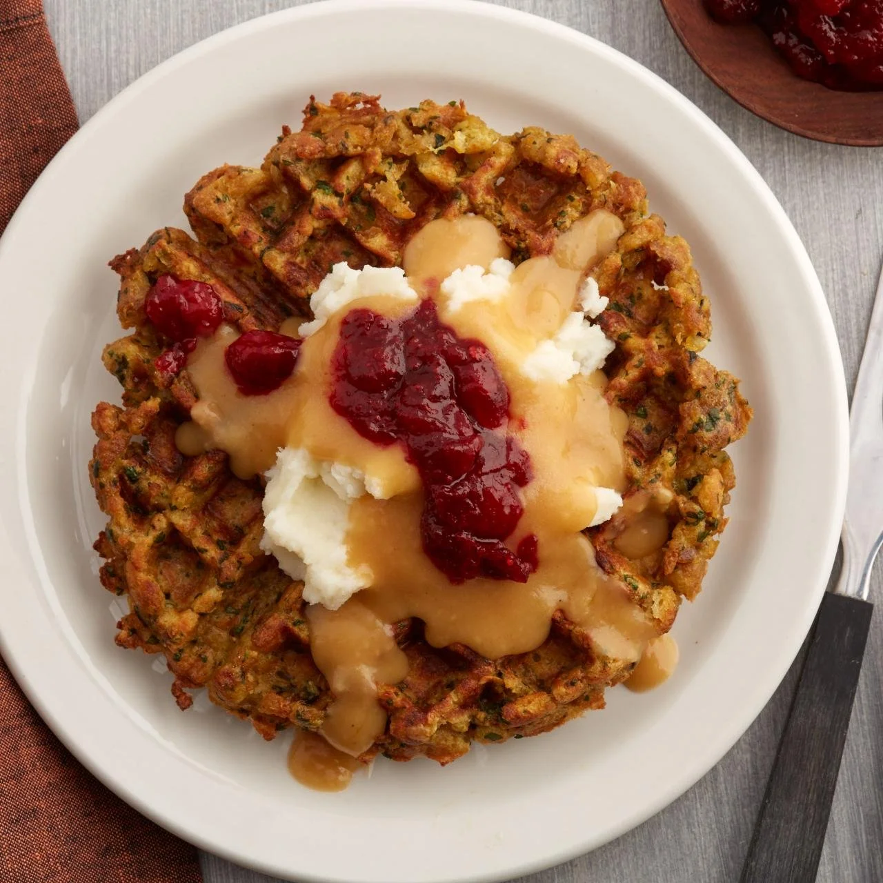 Discover the unexpected delight of transforming stuffing into a waffle, crowned with a medley of delectable Thanksgiving leftovers - cranberry sauce, turkey, and gravy!